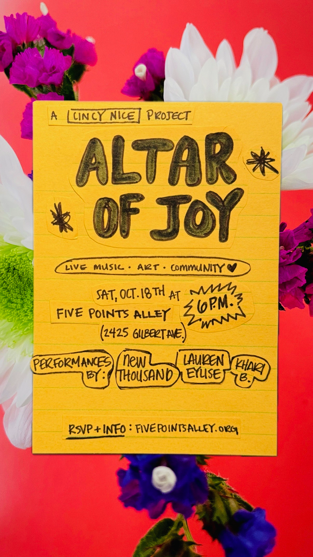 Join us Saturday, October as we turn the Five Points Alley into an altar and together enjoy an evening of live music featuring New Thousand, Lauren Eylise, Khari B and more.
